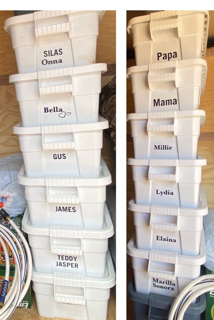Another thing we have found extremely helpful are the Brute totes. We had several we used while camping in years past and they held up wonderfully! So we invested in a few more and it has kept organization possible with all of our stuff. We ordered a dozen white ones for us to use for clothes. Elaina made labels for each one, so we could easily identify them. The grey ones are holding anything from kitchen supplies, to wood burning stove supplies, to winter jackets. We have some of both sizes and love them!